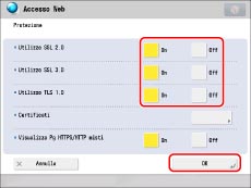 Non è possibile utilizzare SSL se <Utilizzo SSL 2.0>, <Utilizzo SSL 3.0> e <Utilizzo TLS 1.0> sono entrambi impostati su 'Off'.