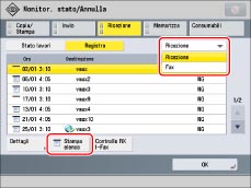 Per stampare la cronologia di ricezione del Rapporto attività fax, selezionare [Fax] dall'elenco a comparsa. (Vedere "RAPPORTO ATTIVITA' TX/RX FAX".)