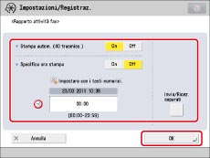 Selezionare [On] per stampare automaticamente il Rapporto attività fax dopo che sono state effettuate 40 trasmissioni/ricezioni.