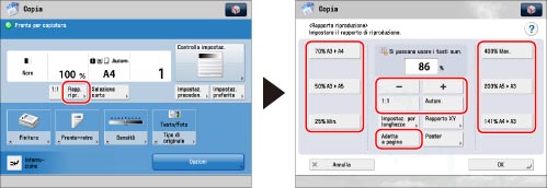 Se si imposta [Autom.], il formato carta dovrà essere specificato manualmente. Se non si seleziona un formato carta, viene impostato un rapporto di riproduzione calcolato in base alla carta caricata nel cassetto 1 oppure nel paper deck destro dell'unità principale.