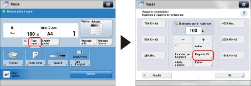 Se si imposta [Rapporto XY automatico], il formato carta dovrà essere selezionato manualmente. Se non si seleziona un formato carta, viene impostato un rapporto di riproduzione calcolato in base alla carta caricata nel cassetto 1 oppure nel paper deck destro dell'unità principale.