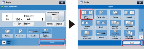 Per eseguire copie in fronte-retro di libri o originali rilegati, utilizzare il modo Libro