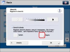Se si regola la densità del fondo premendo [Regola] per <Densità sfondo>, l'impostazione [Autom.] viene annullata. Allo stesso modo, se si preme [Autom.] durante le regolazioni manuali in [Regola], le regolazioni vengono annullate. La macchina regola automaticamente la densità in base allo sfondo.