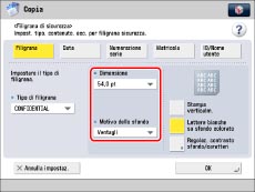 Il testo inserito in [Personalizz.] non viene salvato automaticamente. Se si utilizza [Filigrana di sicurezza], per registrare la filigrana di sicurezza appena creata in modo da poterla selezionare ogni volta che occorre, selezionare [Registra] → immettere il testo da registrare.
