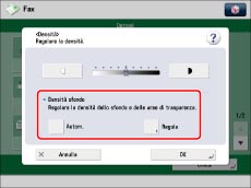 Se si regola la densità del fondo premendo [Regola] per <Densità sfondo>, l'impostazione [Autom.] viene annullata. Allo stesso modo, se si preme [Autom.] durante le regolazioni manuali in [Regola], le regolazioni vengono annullate. La macchina regola automaticamente la densità in base allo sfondo.