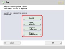 Sulla schermata delle funzioni principali fax vengono visualizzate due opzioni di selezioni veloci. [Originale fronte-retro] e [Originali formati misti] vengono visualizzati come predefiniti. Queste selezioni veloci possono essere modificate nelle funzioni più utilizzate.