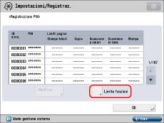 .Il limite al numero di pagine che possono essere generate può essere impostato tra 0 e 999.999 pagine. Una volta raggiunto il limite delle pagine, non è possibile continuare con la copiatura, la scansione o la stampa.