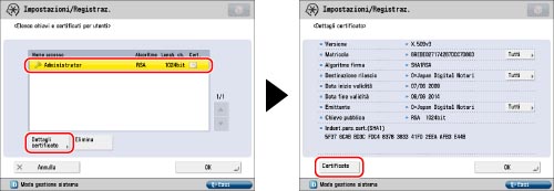 Per informazioni su come un utente generico può visualizzare il certificato di utente, vedere "Controllo di una firma di periferica/del certificato di firma di utente". In questo caso, però, viene visualizzato solo il certificato di utente dell'utente che sta accedendo al momento alla macchina. I certificati di utente degli altri utenti non vengono visualizzati. Inoltre, il certificato di utente non può essere eliminato da questa schermata. Per eliminare il proprio certificato di utente, un utente generico deve utilizzare l'IU remota. (Vedere "Installazione di un file di certificato".)