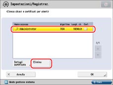 a sinistra di una coppia di chiavi, significa che la coppia di chiavi è danneggiata o non è valida. Dopo avere cancellato la coppia di chiavi, installare una coppia di chiavi e un certificato di utente nella macchina da un computer. (Vedere "Installazione di un file di certificato".)