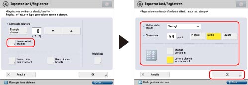 Come impostazione predefinita, per l'esecuzione di una stampa di esempio non è selezionato [Lettere bianche su sfondo col.] nella schermata Impostazioni stampa. Se è selezionato [Lettere bianche su sfondo col.], impostare [Impost. valore standard] per la densità del testo e [Densità area latente] per la densità dello sfondo.