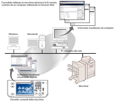 L'IU (interfaccia utente) remota è il software preinstallato che consente di accedere alle funzioni della macchina tramite un browser Web. Ad esempio, l'IU remota consente di accedere alla macchina per controllare lo stato dei processi, la loro esecuzione e per specificare varie impostazioni. Per poter utilizzare l'IU remota, è necessario un browser Web e una connessione di rete tra il computer e la macchina. Inoltre, occorre immettere un indirizzo IP (Internet Protocol) dal pannello comandi e configurare la connessione di rete.