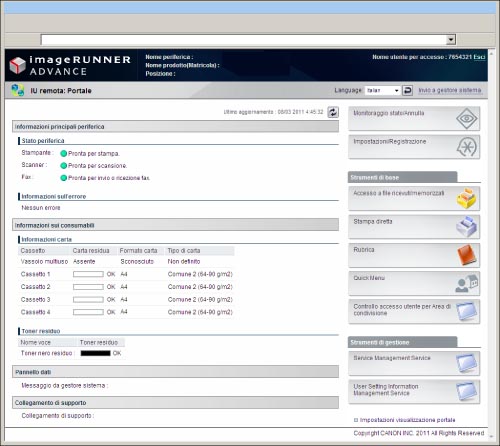 L'IU remota consente di accedere alla macchina dalla rete, permettendo così di visualizzare lo stato attuale della macchina e le impostazioni attive, nonché lo stato di tutte le informazioni e dell'elaborazione dei processi. La macchina può essere utilizzata tramite il computer collegato in rete, senza dover eseguire alcuna operazione sulla macchina stessa. Immettendo l'indirizzo IP della macchina nel browser web, sulla schermata del computer viene visualizzata la pagina iniziale o la schermata principale della IU remota, come illustrato di seguito: