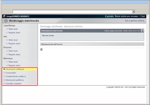 L'IU (Interfaccia Utente) remota può essere utilizzata per controllare lo stato della macchina, ad esempio per verificare la quantità di carta disponibile nelle varie fonti di alimentazione carta e per verificare se sono stati riscontrati errori. È anche possibile ottenere informazioni sul gestore del sistema, sulla posizione di installazione e sulle impostazioni di protocollo della macchina.