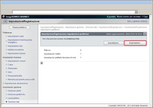 Fare clic su [Importazione/Esportazione] → [Impostazioni periferica (Impostazioni inoltro, Rubrica, Impostazioni preferite funzione di invio)] → [Esportazione...].
