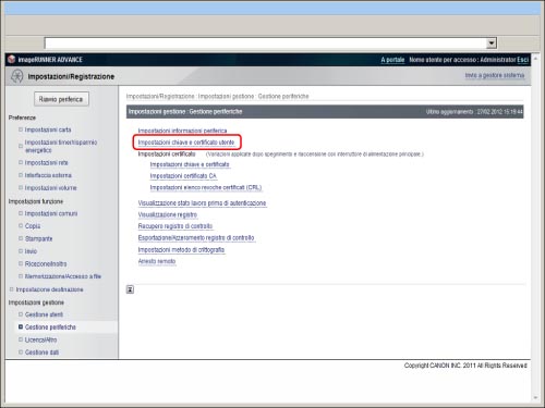 È possibile utilizzare l'IU remota per installare la coppia di chiavi, il certificato di utente e l'elenco delle revoche dei certificati necessari per le firme degli utenti nella macchina.