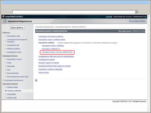Questa funzione consente di registrare/controllare/eliminare un elenco delle revoche dei certificati (CRL).