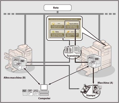 È possibile acquisire un originale con la macchina, registrarlo (in formati, quali PDF, JPEG o TIFF) e stampare il file archiviato dalla macchina in qualsiasi momento tramite le impostazioni di stampa desiderate.