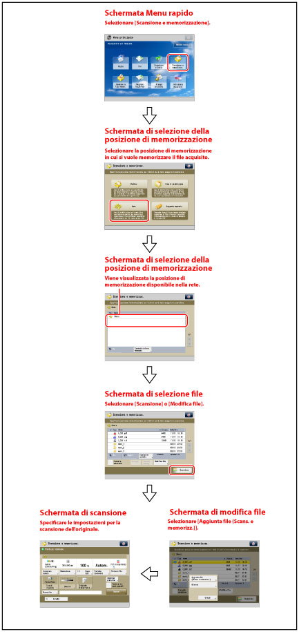Per istruzioni sulla disposizione delle cartelle, il controllo delle informazioni dettagliate sul file e la modifica/eliminazione dei file, vedere "Accesso a file memorizzati".