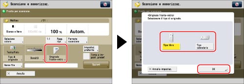 Premere [Originale fronte-retro] → selezionare il tipo di originale → premere [OK].