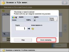Se al termine della scansione dell'ultimo gruppo di originali viene visualizzata la seguente schermata, selezionare [Avvio memorizz.].