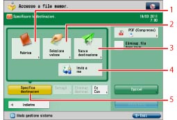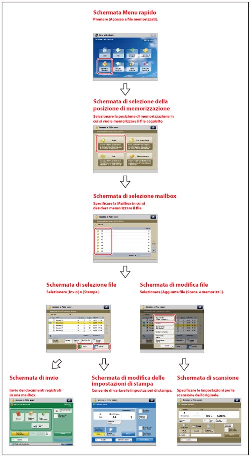 Per la procedura di [Aggiunta file (Scans. e memorizz.)] e le istruzioni sull'utilizzo della schermata di scansione, vedere "Aggiunta di un file (Scansione e memorizzazione)" e "Flusso delle operazioni di scansione e memorizzazione".
