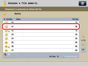 Nella schermata del menu principale, selezionare [Accesso a file memorizzati] → [Mailbox] → selezionare il numero di mailbox in cui è registrato il documento.