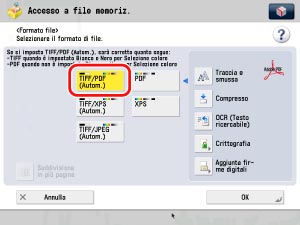 Selezionare il formato di file per l'invio, ad esempio [TIFF/PDF (Autom.)].