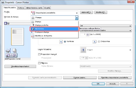Fare clic sulla voce [File] del software applicativo utilizzato per la stampa del documento → selezionare [Stampa] per visualizzare la finestra di dialogo [Stampa] → fare clic su [Proprietà].
