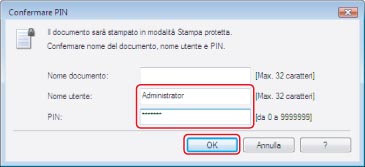 Immettere nome del documento, nome utente e password nella finestra di dialogo [Stampa protetta] → fare clic su [OK].