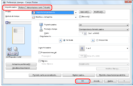 Fare clic sulle schede [Imposta pagina], [Finitura], [Alimentazione carta] e [Qualità] e quindi specificare gli elementi desiderati.