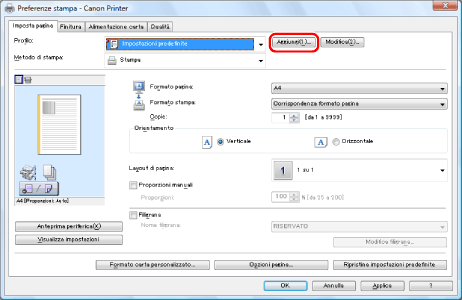 Per modificare o cancellare un profilo, nella schermata del driver della stampante, fare clic su [Modifica] alla destra di [Profilo]. Tuttavia, i profili predefiniti non possono essere modificati.