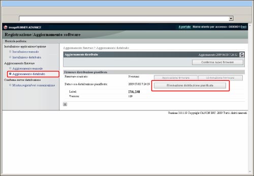 Premere [Aggiornamento firmware] → [Eliminaz. distribuz. pianificata].