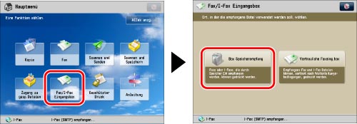 Berühren Sie nacheinander die Tasten [Fax/I-Fax Eingangsbox] → [Box Speicherempfang].