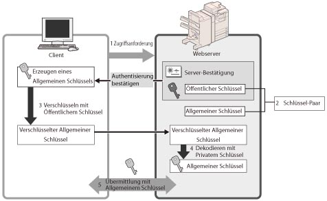 Wenn ein Anwender auf das System von seinem Computer aus zugreift, werden das SSL-Serverzertifikat und der öffentliche Schlüssel des Servers angefordert.