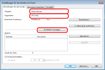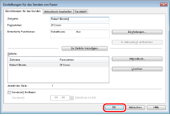 Wenn Sie [Geben Sie die Faxnummer erneut ein, bevor Sie ein Ziel zur "Zielliste" hinzufügen] im Dialogfeld [Sicherheitseinstellungen] der Registerkarte [Spezial] ausgewählt haben, wird das Dialogfeld [Kennwort bestätigen] angezeigt, wenn Sie auf [Zu Zielliste hinzufügen] klicken. Nähere Informationen hierzu finden Sie in der Online-Hilfe (vgl. "Anzeigen der Online-Hilfe").
