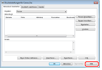 Sie können sich die Online-Hilfe durch Anklicken der Schaltfläche [Hilfe] des Faxtreiber-Bildschirms anzeigen lassen.
