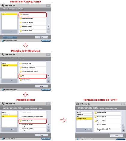 en el panel de control e iniciando sesión como administrador a través de la pantalla táctil. Para obtener información sobre los tipos de administradores, consulte "Opciones de administrador".Especifique las opciones en [Red] en [Preferencias] según su entorno de red. Las siguientes capturas muestran el flujo de las operaciones para especificar las opciones de red.