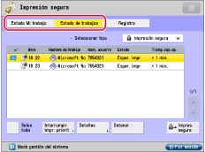 Los trabajos de impresión segura y los trabajos de impresión segura cifrada que envíen otros usuarios se muestran con asteriscos ('********'), y no se puede realizar ninguna operación con ellos.