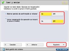 Si selecciona [On], las operaciones guardadas en el botón se inician sin confirmación de la configuración cuando pulsa el botón guardado. No es necesario pulsar
