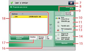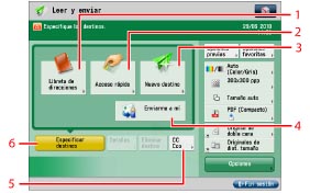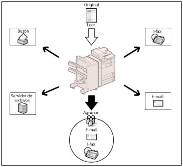 Se pulsa para seleccionar y utilizar otros modos disponibles para leer y enviar. Configure funciones de envío útiles, como enviar juntos originales de distinto tamaño o enviar originales de doble cara.