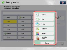 (E-Mail) (Fax) (I-Fax) (Servidor de archivos) (Grupo) |
