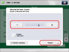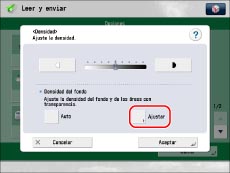 Si ajusta la densidad del fondo pulsando [Ajustar] en <Densidad del fondo>, la opción [Auto] se cancelará. De forma similar, si pulsa [Auto] mientras realiza ajustes de forma manual en [Ajustar], sus ajustes se cancelarán. El equipo ajusta automáticamente la densidad para que coincida con el fondo.