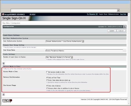 Aunque especifique las opciones para <Access Mode in Sites>, la información de sitio no se recupera al iniciar sesión desde un navegador web.