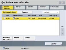 , aparece la pantalla Monitor estado/Cancelar, que le permite comprobar y cambiar el estado de los trabajos de copia/impresión, envío, recepción y almacenamiento.