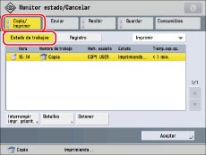 Imprime la lista de estado de los trabajos. [Imprimir lista] aparece cuando se ha seleccionado un trabajo. Pulse [Imprimir lista] → [Sí] para imprimir la lista.
