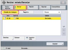 Muestra información detallada del trabajo seleccionado. Compruebe la información detallada → pulse [Aceptar] para volver a la pantalla Enviar.