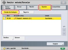 Muestra información detallada del trabajo seleccionado. Compruebe la información detallada → pulse [Aceptar] para volver a la pantalla Guardar.