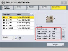 La siguiente tabla indica la cantidad restante de consumibles.