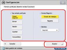 Si selecciona [Copia/Imprimir], [Enviar] o [Recibir], puede establecer el tipo de trabajo que se mostrará.