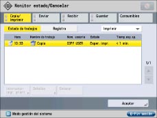 Si establece [Copia/Imprimir], [Estado de trabajos], [Imprimir] como Pantalla prefijada (Monitor estado/Cancelar):